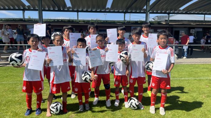 最終日のトレーニングは試合形式が中心で、日本人選手が所属するチームが決勝戦へと駒を進めました。そして迎えた決勝戦、白熱した展開の末に見事優勝!コーチからも「あの選手はいいね」と高く評価される場面もあり、チーム全員が誇らしげな表情を見せていました。こうして5日間のバイエルンキャンプは幕を閉じ、最後には一人ひとりに修了証と、なんとサッカーボールまでプレゼントされました。選手たちにとって、このボールは忘れられない思い出の品となるでしょう。